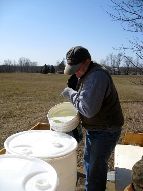 Next is the collection of the sap which is done on a daily basis. We go to each tree and dump the contents of the buckets into a container or drum so that it can be hauled to the "sugar house" where it will be boiled down into syrup. It takes anywhere from 35 to 50 gallons of sap to make a gallon of syrup depending on the sugar content of the sap. The higher the sugar content the less sap needed to make a gallon of syrup, the lower the sugar content the more sap that is needed.