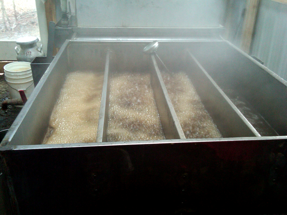 Once the sap is collected and hauled to the "Sugar House" the process of boiling it down can begin. The sap is poured into a pan usually over a wood fire contained in an "arch". The combination of arch and pan is called an evaporator and often includes a hood which captures the rising steam to preheat the sap before it goes into the pan for boiling. How fast the sap is converted into syrup is based on the amount of sap being boiled and the surface area of the pan. The greater the surface area of the pan the faster the excess water is evaporated and syrup is created. Once all the excess water is boiled off what is left is pure maple syrup.