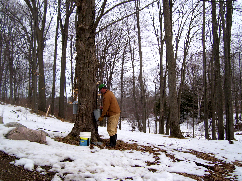 The first step in the process is to tap maple trees so that the sap from the trees can be gathered. We use the tried and true method of drilling a small hole into the tree and then inserting the "tap" which is a small hollow metal tube through which the sap from the tree will flow into a bucket which is hung on the tree. In large operations, plastic tubes can be attached to the taps and run to a large holding container or even pumped great distances to holding containers. Trees are tapped towards the end of winter when daytime temperatures begin to stay above freezing while night time temps stay below freezing. These conditions cause the sap to start to "flow".